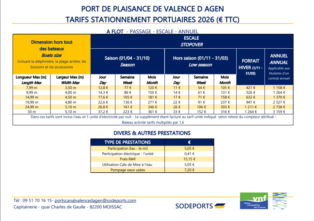 Le port de plaisance de Valence d’Agen est situé sur le canal latéral à la Garonne, au cœur d’un environnement paisible et arboré, à deux pas du centre-ville. Cette escale conviviale séduit les plaisanciers par son cadre naturel et son atmosphère authentique. Bien équipé et facilement accessible, le port constitue une halte idéale pour découvrir le patrimoine local et profiter d’une pause agréable sur l’itinéraire du Canal des Deux Mers.